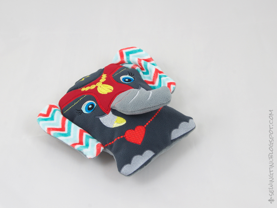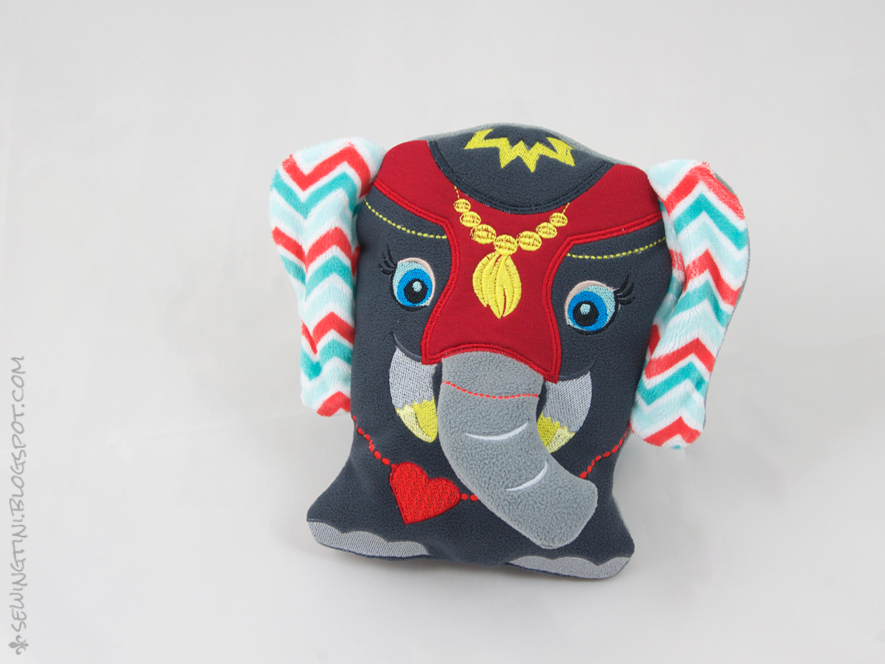 Eine ganz einfach „Geburt“ war der Kleine nicht und hat deshalb auch den ein oder anderen Schönheitsfehler. Ein mit Watte ausgestopfter Rüssel im Stickrahmen bedarf eben ganz besonders viel Aufmerksamkeit und einmal kurz Umdrehen, um die nächste Garnfarbe parat zu haben und schon war es passiert: der Rüssel kam unter den Stickfuss und das halbfertige Ding war aus dem Rahmen gerissen.