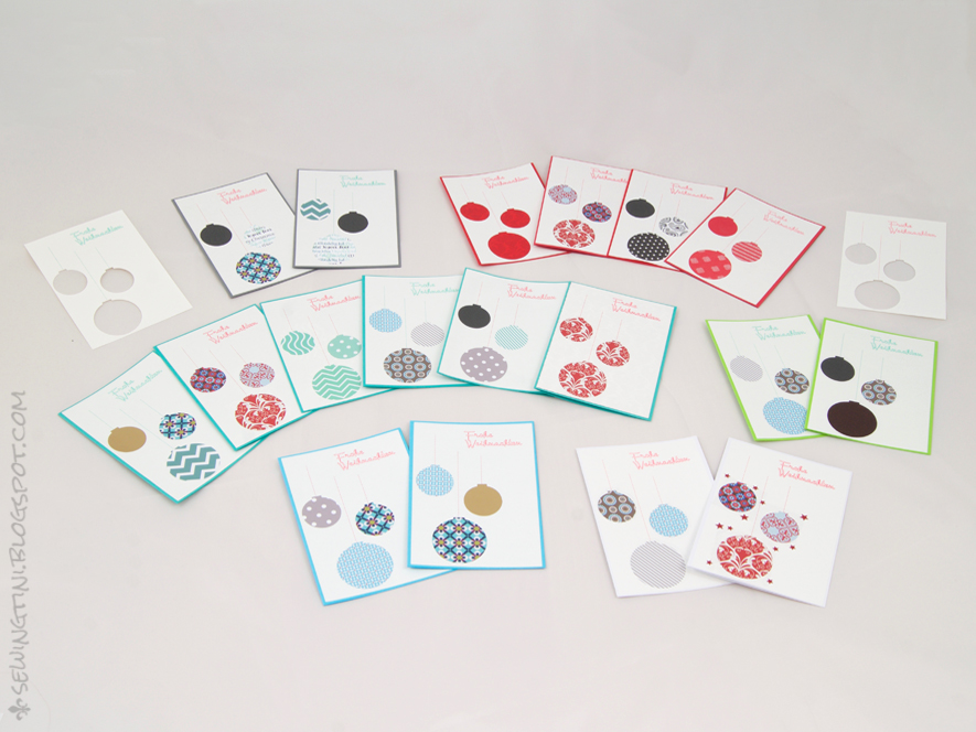 Die ersten Karten habe ich mit verschiedenen gemusterten Papieren hinterlegt. Da sich dies als etwas sehr zeitaufwändig herausstellte und mein Kleber sich auch immer mehr entleerte, hatte ich die Idee, Baumkugeln aus Vinyl zu schneiden. Mit der Offsetfunktion habe ich sie etwas vergrößert und hintendran geklebt. Da muss man beim Positionieren schon ganz schön aufpassen, damit alles passt. Bis ich dann endlich die Idee hatte, die Baumkugeln aus Vinyl in Originalgröße zu schneiden und wie oben erwähnt die Karte nur zu beschriften. Das Aufkleben der Kugeln ging dann schon deutlich schneller und das war bei fast 30 Karten dann auch gut so :).