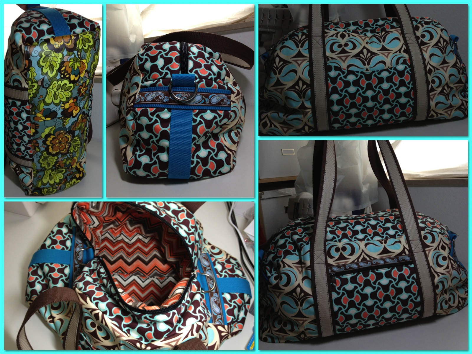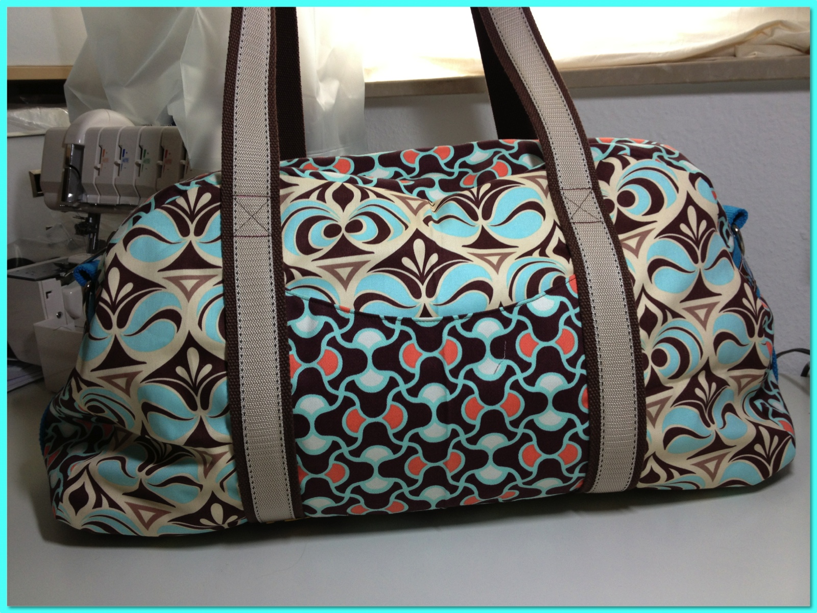 Und der Schultergurt an den kurzen Seiten fehlt, da ich erst noch Karabiner kaufen muss. Aber der Gurt wird aus dem türkisfarbenen Gurtband wie an den Seitenteilen. Ob mit oder ohne Webband – das muss ich dann mal kucken. Allerdings sind meine Griffe auch jetzt schon sehr lang und ich kann die Tasche so schon über der Schulter tragen.