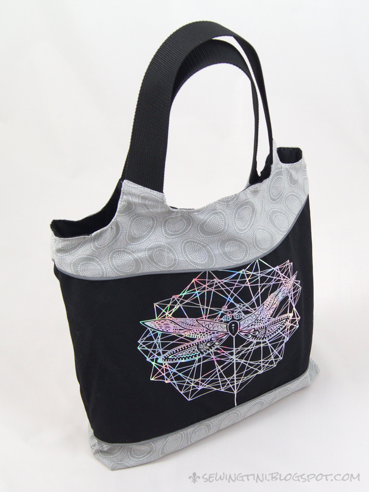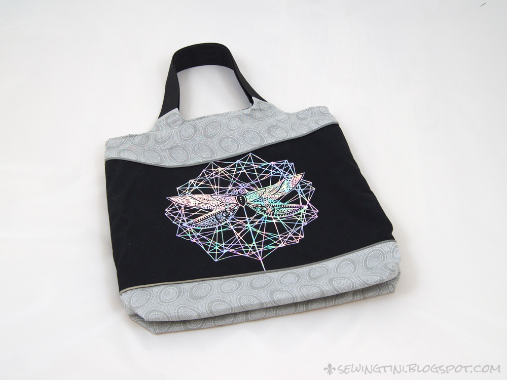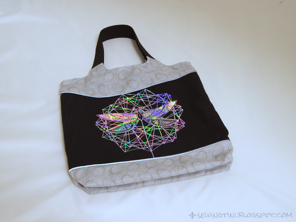 Gleich schon als ich das Thema las, war mir klar, dass ich einen schwarzen Stoff auf der Außenseite verarbeiten mag und dass darauf die Libelle von fusselfreies aus Regenbogen Hologramm Folie kommen soll (beides aus meinen Adventskalendern 2016). Die Libelle habe ich gleich Anfang des Jahres geplottet und an 3 verschiedenen Tagen entgittert *lach*. Nachdem ich mich an die etwas dickere Hologrammfolie gewöhnt hatte, ging das Entgittern auch richtig gut und meine neue Pinzette war mir auch eine große Hilfe.