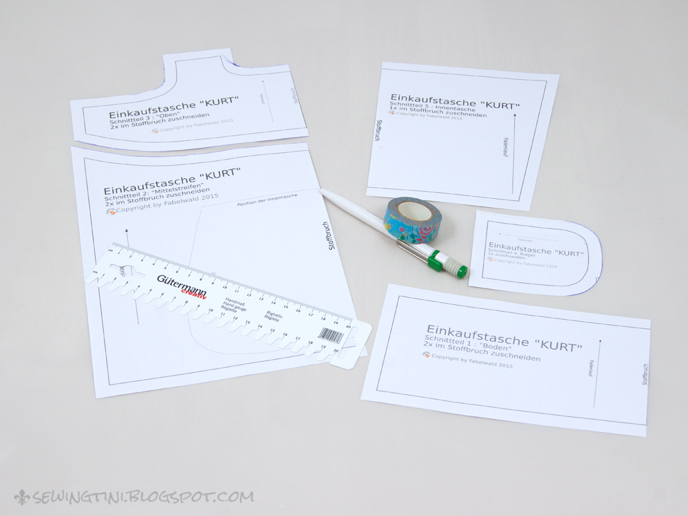 Bei Kurt kommt dazu, dass das Aussenteil aus 3 verschiedenen Teilen besteht, die Innentasche aber aus genau diesen 3 Teilen zusammengesetzt besteht. Aber auch da gibt es einen ganz einfachen Trick. Ich klebe die Teile mit NZ einfach überlappend mit Washi Tape zusammen und schneide dann die Futterteile zu. So kann ich aber für eine eventuell weitere Tasche die Schnitteile auch ganz einfach wieder auseinander nehmen, um auch die nächste Tasche mit Unterteilungen zu nähen.