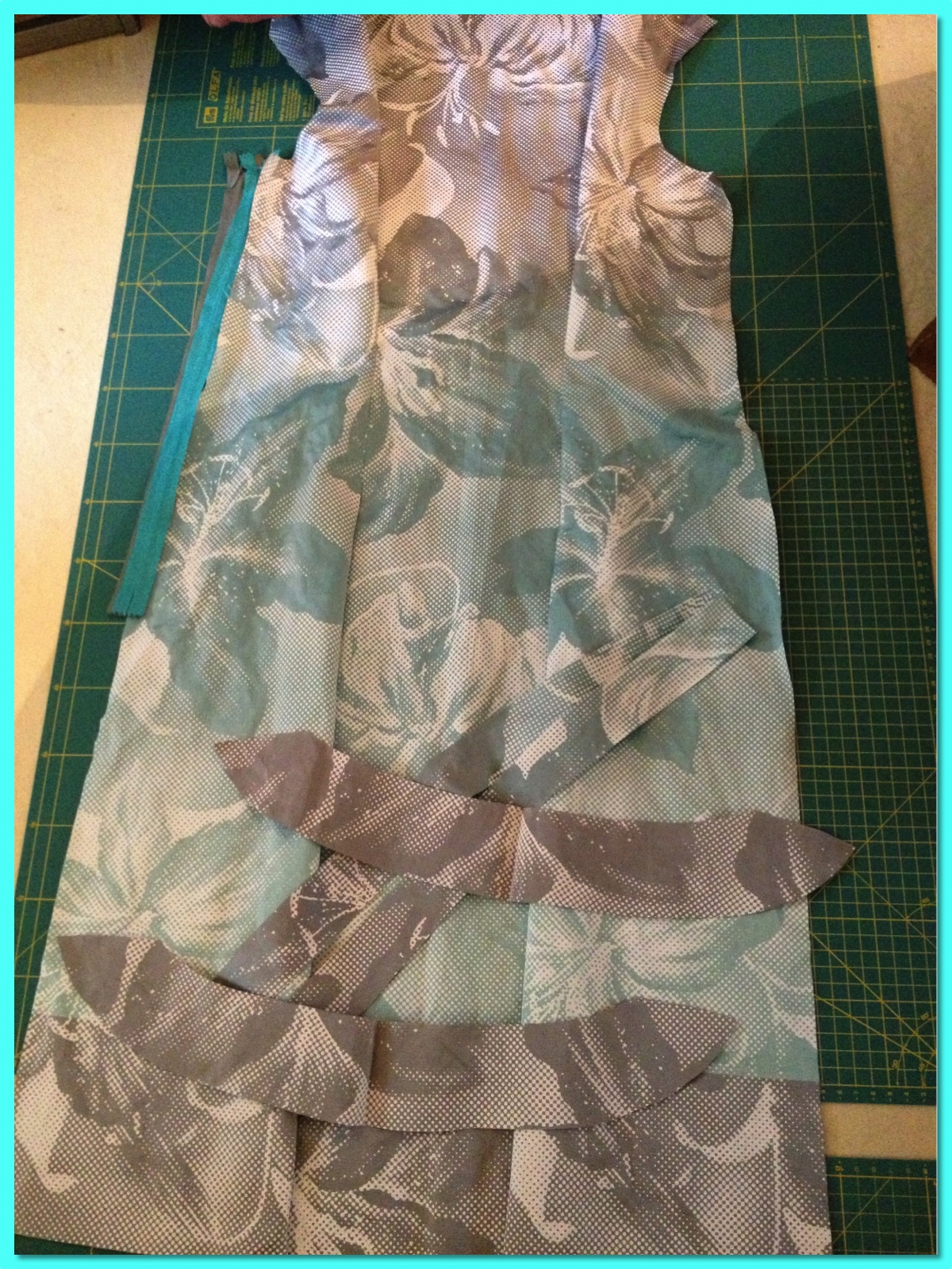 Ja, ich habe mich am Samstag endlich getraut, den Stoff anzuschneiden. Bei Vor- und Rückteil musste ich ja auch darauf achten, dass der Farbverlauf hinterher dann auch passt. Da habe ich mich u.a. auch an der Taillenmarkierung orientiert. Nur die Vlieseline für die Belege muss ich noch zuschneiden.