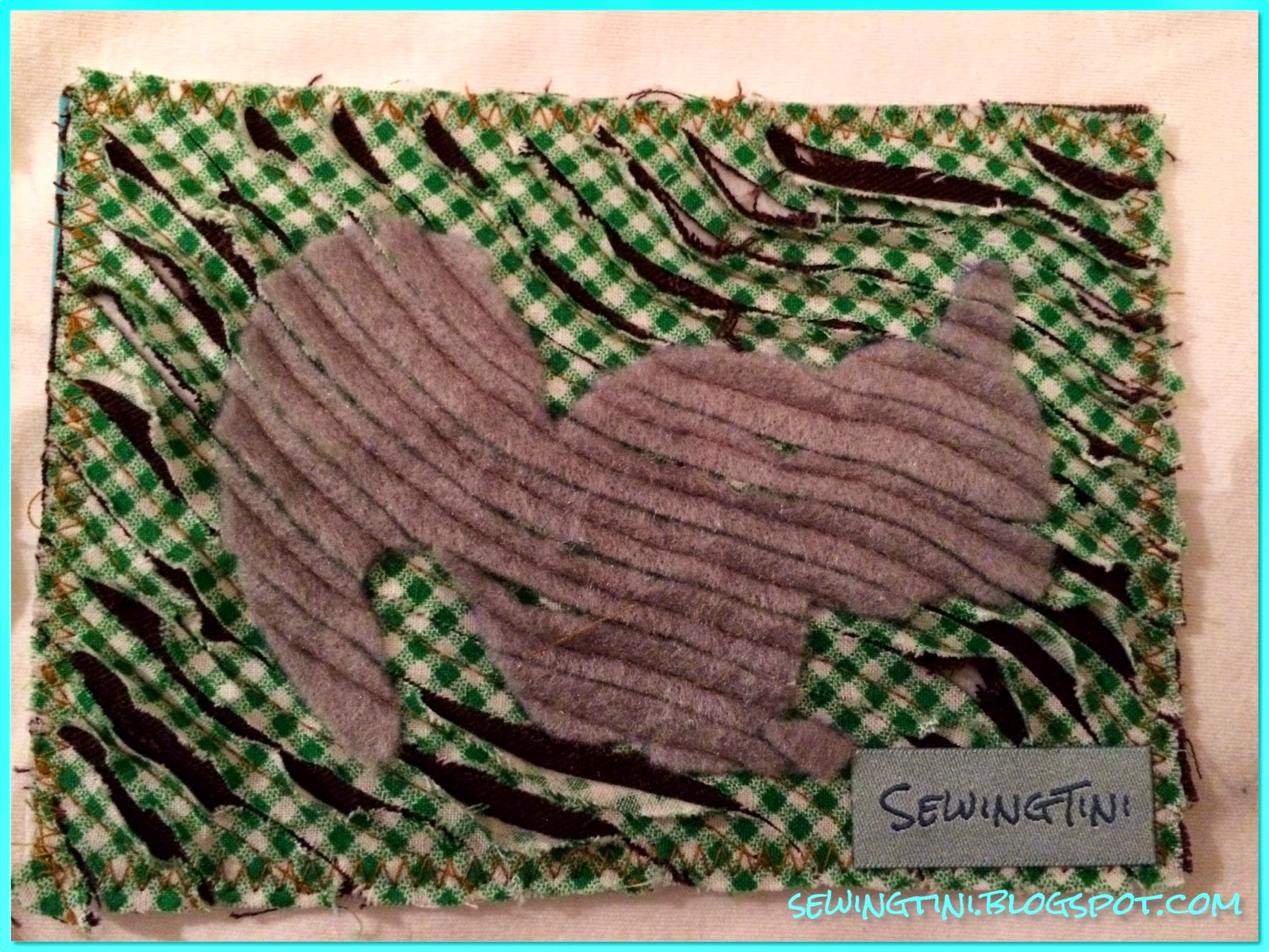 Nun wollte ich das Thema Waldtiere aufgreifen und wollte den Stoff nicht nachträglich mit Applikationen „verunstalten“, da ich Angst hatte, dass der Chenilleeffekt dann nicht mehr gut zur Geltung kommt. Also habe ich aus Filz Waldtiere ausgeschnitten und diese auf ein Stück grünen Stoff und ein Stück braunen Stoff mit Vlieseline darunter gesteppt und habe alle 3 Stoffschichten aufgeschnitten. Leider war der braune Stoff unter sehr fest, aber ich mag den Effekt der dabei entsteht trotzdem total gerne. Und hier sind sie nun, meine genähten Novemberkarten: