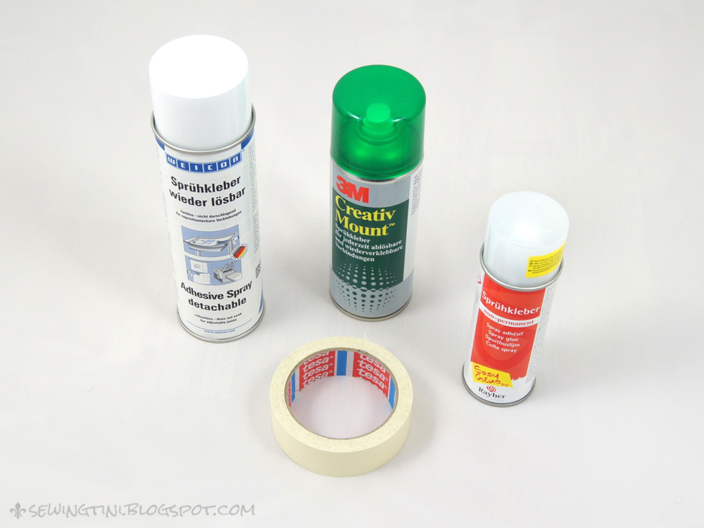 Verwendet habe ich von Welcon „Sprühkleber wieder lösbar“, von 3M Kreativ Mount „Sprühkleber für jederzeit ablösbare und wiederverklebbare Verbindungen“ und von Rayher „Sprühkleber non-permanent“.